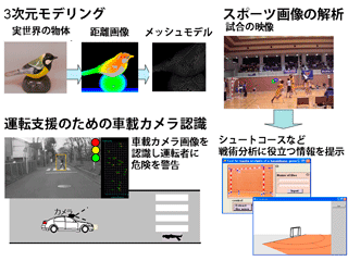 清水研究室では、カメラとコンピュータで視覚機能を実現するための研究を行っています。2次元のデータであるカメラ画像から、3次元の実世界を認識するための基礎となるアルゴリズムの開発や様々な実用的なシステムへの応用を目指しています。